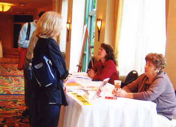 Penny Sansevieri, Author Marketing Experts, Inc., signs her book, "Red Hot Internet Publicity" as Anna Flowers, right, signs her new release, "Wanton Woman," during the Florida Writers' Association Conference at Lake Mary, FL.